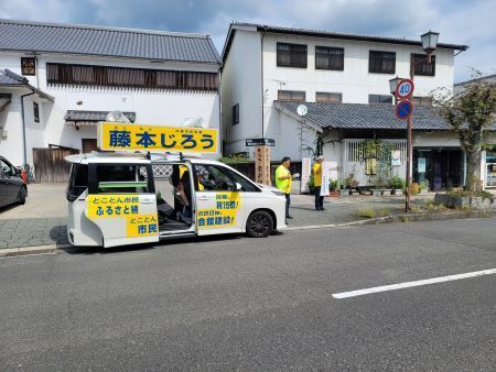 候補者・藤本じろうさん、そして綾部後援会長とともに遊説カーに同乗し、