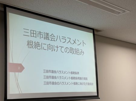 三田市は、主に「三田市議会ハラスメント根絶条例」について勉強させていただきました。