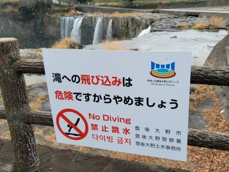 飛び込み事故で発生した原尻の滝の注意看板
