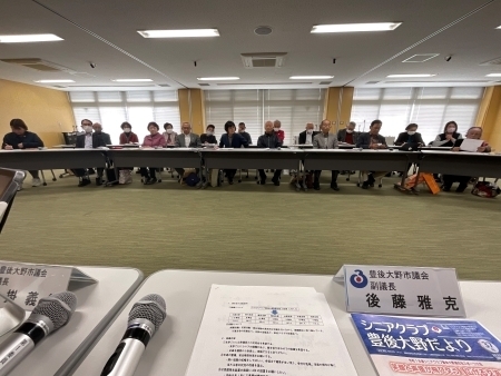 その後、15時30分よりシニアクラブ豊後大野連合会の皆さまと市議会議員全員による意見交換会が開催されました。シニアクラブの役員19名が参加され、白熱した議論が交わされました。