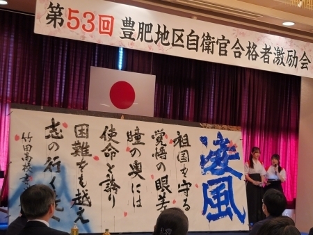 竹田高校書道吟詠部の演舞から始まり、元防衛大臣の岩屋毅前外務大臣をはじめ多くの来賓からの祝辞と小泉進次郎防衛大臣のビデオメッセージで合格者を激励されていました。合格者からも力強い決意の言葉を伺い頼もしさを感じました。